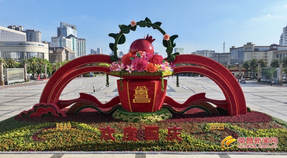 9月26日,在南昌市八一廣場,“歡度國慶”主題大型花卉造型正式亮相,以爛漫花海、精巧意象與鮮明主題,為市民游客勾勒出一幅喜慶祥和的節日畫卷。據介紹,該國慶主題花卉造型占地約700平方米,高12.5米,由“石榴抱?!迸c“繁花花籃”兩大核心意象構成,擺花用量6萬余盆,為造型注入鮮活色彩與自然生機,烘托出濃郁的迎國慶氛圍。(王堃 洪觀新聞記者 高學斌/文 馬悅/圖)