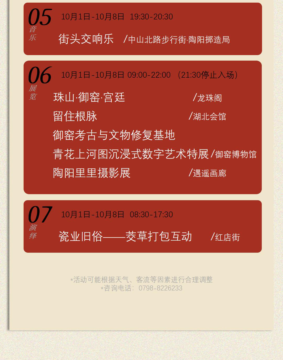 for (var i = 0,len = adKeys.length; i 來源:景德鎮發布 親愛的朋友們,翹首以盼中 中秋與國慶攜手而來 一場盛大的歡樂盛宴即將開啟 在這個象征團圓與繁榮的美好時節 愿您提前規劃,盡享悠長假期 古窯民俗博覽區 01瓷業習俗-窯神童賓祭祀儀式 窯神童賓祭祀儀式,演繹清代督陶官唐英誦讀祭文。整個祭祀過程由列隊、行進、登壇、請神、斗戲、奠祭、讀祭、焚祭等環節組成,活動場面盛大、隆重。 時間:10月1日上午10:18 地點:童賓廣場 02 元代饅頭窯復燒點火儀式 “歷代瓷窯煉就千年瓷都,系列復燒彰顯中華文明”。一件件素坯在熊熊烈火的窯爐里,涅槃重生般的變成一件件精美的瓷器,感受著“守正創新、薪火相傳”的原真性意義。點火現場還能親身參與“人人加柴 家家財旺”燒窯體驗活動。 時間:10月1日上午11:08 地點:元代饅頭窯 03 祥獅獻瑞迎窯寶 威武雄獅將踩著鼓點登場搖頭擺尾間為饅頭窯開窯送上祥瑞祝福更承載著窯寶滿倉的美好期許。點火現場還能親身參與“人人加柴 家家財旺”燒窯體驗活動。 時間:10月6日上午9:08 地點:歷代瓷窯展示區 04 元代饅頭窯開窯見寶 歷經高溫淬煉的窯寶將逐一亮相現場游客可近距離觀察釉色變化、紋理細節親身感受“入窯一色,出窯萬彩”的魔力。 時間:10月6日上午11:08 地點:元代饅頭窯 這個國慶假期,不妨帶上家人朋友,來景德鎮“活”的博物館——景德鎮古窯民俗博覽區赴一場陶瓷文化之約。 我在景德鎮等你,我在古窯遇見你。 陶陽里歷史文化旅游區 十一恰逢中秋 團圓歡聚來逛景德鎮陶陽里 這份活動攻略為旅行增添期待 陶溪川文創街區 2025年9月 陶溪川設計師集結首期即將啟幕 共赴一場“培根-創造-候鳥”的創意共生之旅 讓每一份靈感都能在這里找到生長的土壤 活動內容包括 集市、展覽、講座、課程、音樂表演 五大內容板塊。 9/25-9/27、9/30-10/03、 10/9-10/11、10/23-10/25 開集時間:16:00—22:00 國慶中秋假期 9月30日——10月8日 陶溪川創意集市連續開放 開集時間:18:00—22:00 假期過后 陶溪川春秋大集·秋集 即將開啟 敬請期待 浮梁古縣衙 赴浮梁古縣衙國慶之約,赴一場古今之會!千年文脈與新潮活力在此交融,音樂、非遺、夜游三重驚喜,承包你的國慶愜意時光~ 壹 特色非遺集市: 舌尖與指尖的文化之旅 非遺“景德鎮瓷業水碓營造技藝”展示,也有陶瓷拉胚技藝可親手體驗;太極展演剛柔并濟,舞龍燈更添節日熱鬧。 舌尖上的非遺更不容錯過!堿水粑、清明粿、手工生日餅等多種傳統美食現場制作,試吃、購買一鍵get;浮梁功夫紅茶茶藝表演香氣四溢,還有可定制的傳統糖畫,每一口每一件都是文化記憶。 貳 浮梁古城音樂游園會: 古裝電音嗨翻古城 當“明鏡高懸”遇上動感鼓點,這場“古裝+電音”的狂歡絕對顛覆想象!主舞臺以古縣衙為背景,搭配炫酷燈光與特效,世界百大DJ Killa領銜20多位藝人,將古箏、二胡等民樂元素融入電子音樂,打造專屬浮梁的國潮電音現場。 全場藝人與NPC身著漢服,帶你沉浸式穿梭古今。漫步游園中,既能聽民樂開場、國潮電音升溫,又能打卡漢服體驗,后續更有文創市集常態化運營,讓古城的夜晚越夜越精彩! 時間:10月1日-6日 18:00-21:30 地點:千年瓷壇廣場 叁 夜游浮梁古城: 燈火里的千年風情 夜幕下的古縣衙美出新高度!歷史長廊燈籠搖曳,中軸線古文燈條點亮夜空。MOJ咖啡草地藏著文藝驚喜,下午有大學生草地音樂會,充氣沙發隨便躺;千個紅燈籠搭成的打卡墻超出片,并且還有猜燈謎抽獎活動,氛圍感拉滿! 身著襦裙廣袖穿行其間,一抬手一回眸,千年古韻便藏進了鏡頭里,每一幀都是絕配,來浮梁古縣衙,一定要拍套漢服寫真!青石板路映著衣袂翻飛,“明鏡高懸”下定格身姿,古建與華服的碰撞,出片效果直接拉滿,氛圍感絕了~ 這個國慶,來浮梁古縣衙赴一場古今之約,在電音里沸騰,在非遺中沉醉,在燈火下留影,讓“瓷之源、茶之鄉、古衙之地”的魅力,刻進你的假期記憶~ 高嶺文化村 假期怎能不搞點快樂? 打工人的快樂密碼來了! 一支麥脫口秀大咖空降,爆笑吐槽生活梗, 互動環節讓你秒變段子手! 準備好256G的肚子來裝笑聲吧! 八天聽唐盛宴+爆笑脫口秀 直接把氛圍感拉滿! ? 爆笑脫口秀 ? 聽唐盛宴 ? 奇幻夜游 ? 非遺魚燈 ? 古風樂隊 ? 浪漫煙花 穿越盛唐的旅程就此開啟! 洪巖仙境 國慶長假來啦!不用糾結去哪玩~溶洞夜游、戲曲大賽、非遺演繹、美食集市等超多活動保你假期充實又快樂! 溶洞夜游 每天 17:00 - 20:30 溶洞夜游 69 / 人特價票限時開啟! 這波福利可別錯過~ 戲臺夜游 戲臺燈火通明,自由麥想唱就唱 逛美食集市,沉浸式夜玩超盡興~ 戲曲大賽季度賽 10月1日-6日好戲連臺! 10:00-12:30戲曲大賽季賽火熱開唱 14:00-16:00 設游客互動環節 千萬別錯過這場難得的戲曲視聽盛宴~ 水上戲臺自由麥 每天18:00 - 20:30 水上戲臺自由麥live 準時開唱 一起嗨翻夜晚~ 煙花秀&非遺表演 10月1日、2日、6日 19:00-19:30: 煙花秀絢麗綻放 10月1日-3日 19:30-20:00: 火壺非遺演繹精彩開演 非遺美食集市 不用跑遍各地,這場非遺美食集市就能讓你解鎖“舌尖 + 玩樂” 雙重滿足! 更多文化和旅游活動 景德鎮中國陶瓷博物館 1. “景博·瓷文化”課堂 活動日期:10月1日-10月8日上午9:30 參與人群:6-12歲少年兒童(限20人) 活動內容:聆聽陶瓷藏品背后的故事、體驗傳統制瓷工藝,收獲獨一無二的非遺文化記憶 2. 小小探瓷家——景