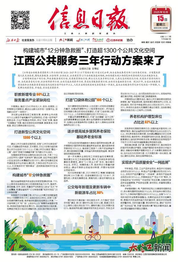 for (var i = 0,len = adKeys.length; i 《江西省公共服務質量提升三年行動方案(2025-2027年)》(以下簡稱方案)日前正式公布,給全省各地各有關部門分任務定目標。方案聚焦提高人民生活品質,圍繞政務服務、社會保障、公共就業、公共教育等12個公共服務監測領域,加快構建體現江西特色和優勢的現代化公共服務體系。 方案明確實施十項行動,即政務服務便利行動、優質教育供給行動、群眾文化生活多樣化行動、人居生態環境優化行動、優質醫療資源均衡行動、全民健身普及行動、社會保障提升行動、公共交通品質提升行動、養老托育服務提質行動、公共安全基礎夯實行動。到2027年,全省公共服務質量指數和公共服務質量滿意度均達到全國平均水平以上,人民日益增長的美好生活需要進一步滿足,基本公共服務均等化和可及性進一步增強,人民群眾的獲得感、幸福感、安全感顯著提升。 職教新增專業60%以上服務重點產業緊缺崗位 方案提出,推動12345熱線與人大、政協、檢察院、公安等單位對接聯動,建設企業群眾訴求統一受理平臺,實現群眾訴求“一呼即辦”。 深化職業教育和技工教育改革,新增專業布點數60%以上服務于省域重點產業緊缺崗位,打造一批市域產教聯合體、行業產教融合共同體。深化“雙減”改革,推進“五育融合”發展,推動實施學生體質強健、美育浸潤、科學教育、勞動習慣養成等行動計劃。 打造新型公共文化空間1300個以上 健全公共文化服務設施網絡,實施“公共文化新空間”行動,打造融合圖書閱讀、藝術展覽、文化沙龍等功能的新型公共文化空間1300個以上,打通公共文化服務“最后一公里”。組織“百館萬場贛鄱共享”系列群眾文化活動。 加強固體廢物綜合治理和生活垃圾分類,力爭7個以上設區市列入國家“無廢城市”建設名單,設區市城區居民小區生活垃圾分類覆蓋率達到100%。提升各地建成區城市道路濕法作業機械化清掃率,力爭各設區市達到90%以上。扎實推進農村“廁所革命”,因地制宜選擇農村生活污水治理模式。 構建城市“12分鐘急救圈” 推動全省縣域醫共體全部達到緊密型建設標準,75%以上縣級綜合醫院達到三級醫院服務能力水平。推進市、縣級胸痛、卒中、創傷、危重孕產婦和新生兒救治“五大”中心全覆蓋,構建全省城市“12分鐘急救圈”和農村地區“20分鐘急救圈”。 實施醫療衛生強基工程,80%以上鄉鎮衛生院配備數字化X線攝影系統(DR)、全自動生化分析儀。實施“三醫”協同便民惠民舉措,有序推進檢查檢驗結果互認共享、“一次掛號管三天”和“‘碼’上投訴馬上辦”等惠民舉措更好落地。持續規范醫療服務收費行為,深化醫療服務價格改革,完善醫療服務價格動態調整機制,加快《醫療服務價格項目立項指南》落地實施。 打造“口袋體育公園”100個以上 加大健身場地設施供給,以社區嵌入式場地設施建設為重點,加強全民健身中心(小型體育綜合體)、多功能運動場等群眾身邊的場地設施建設,打造“口袋體育公園”100個以上,人均體育場地面積達到3平方米以上。 豐富全民健身賽事活動,打造“運動贛鄱·活力江西”全民健身賽事活動品牌。提升全民健身科學指導服務水平,加強社會體育指導員隊伍建設,每千人擁有社會體育指導員達到3.2名。 逐步提高城鄉居民養老保險基礎養老金標準 為符合條件的困難群體代繳城鄉居民養老保險費,逐步提高城鄉居民養老保險基礎養老金標準,基本醫保參保率穩定在95%以上。推進職工醫保個人賬戶資金跨省共濟,提升醫保服務質量,實現省內異地就醫免備案、享受參保地同等醫保待遇。 進一步完善失業保險和工傷保險省級統籌制度,推進建立補充工傷保險制度,提升工傷保險參保和結算服務便捷性。建成“5+2就業之家”體系,推動高校畢業生、農民工、城鎮困難人員、脫貧勞動力等重點群體就業。健全終身職業技能培訓制度,開展補貼性職業技能培訓。 加大住房保障力度,2025年新開工(籌集)保障性租賃住房3.64萬套(間),改造城鎮老舊小區700余個。開展殘疾人家庭無障礙改造,提高殘疾人居住環境和生活品質。 公交每年新增及更新車輛中新能源車占比90% 提升城鄉交通運輸一體化服務水平,大力推動“四好農村路”建設,新(改)建農村公路3000公里,縣道三級及以上等級公路比例達到70%,建制村通公交比例提升至65%。推進城市軌道交通首末班列車正點運行,列車正點率達到98.5%以上,運行圖兌現率達到99%,實現城市軌道交通與民航、鐵路等交通工具便捷換乘。 開展綠色出行宣傳活動,推動公共交通車輛向綠色低碳更新,推廣新能源車輛,每年新增及更新城市公交車、巡游出租車、網約車中新能源車占比分別達到90%、60%、95%。持續優化適老化無障礙交通出行服務,加快新增或更新低地板及低入口城市公交車輛。 養老機構護理型床位占比達62%以上 實施養老托育服務提質行動。加強失能失智老年人長期照護服務,推動全省養老機構護理型床位占比達到62%以上。深化養老服務改革發展,加快健全覆蓋城鄉的三級養老服務網絡,推進老年人家庭居家適老化改造。居住區應當配套建設公益性的養老服務設施,新建居住區按照每百戶不低于20平方米的標準配套建設養老服務設施。 鼓勵通過新建、改擴建、轉型發展等方式,推動有條件的醫療機構建設護理院,加強護理院的老年醫學
